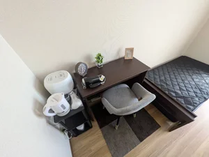 シングルベット、マットレス、フローリングワイパー、電子レンジ、炊飯器、電気ケトル、ソファ(2人掛け)、デスク、チェアー、ローテーブル、スタンドミラー、ハンガーラック、ドライヤー、DVDプレイヤー、TV台、TV、洗濯機(室内)、冷蔵庫、カーテン(レース付き)、かさ立て、置き時計