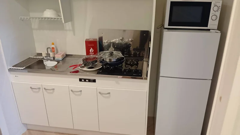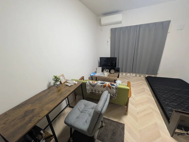 シングルベット、マットレス、フローリングワイパー、電子レンジ、炊飯器、電気ケトル、ソファ、ローテーブル、デスク、チェアー、スタンドミラー、ドライヤー、DVDプレイヤー、TV台、TV、洗濯機(室内)、冷蔵庫、カーテン(レース付き)、3段ラック、かさ立て、置き時計