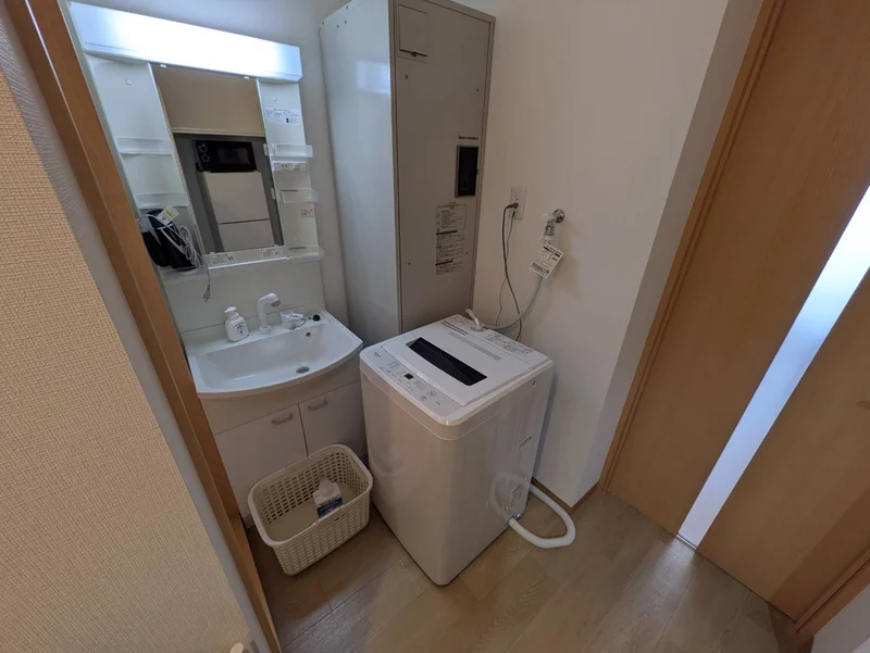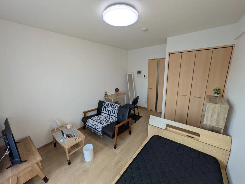 シングルベット、マットレス、フローリングワイパー、電子レンジ、炊飯器、電気ケトル、ソファ、ローテーブル、デスク、チェアー、スタンドミラー、ドライヤー、DVDプレイヤー、TV台、TV、洗濯機(室内)、冷蔵庫、カーテン(レース付き)、3段ラック、かさ立て、置き時計